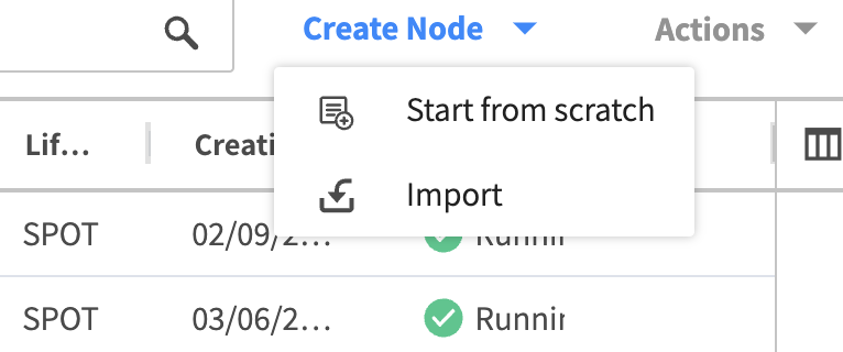 To perform one of the node actions, click the Actions menu on the top right and click one of the actions. The actions available include: